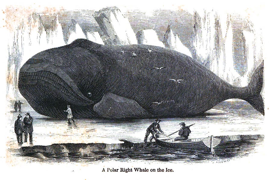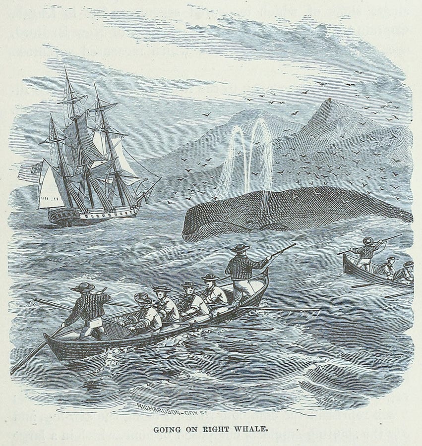 Sperm and right whales were two species hunted for their oil, with the right whale yielding a larger quantity of oil than the sperm (or cachalot) and the bowhead whale. In fact, the right whale received its name for being “right” to hunt due to their slow speed and tendency to float after death.
