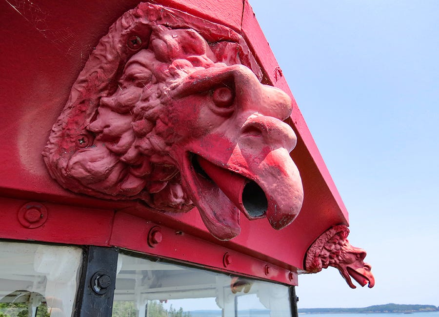 During the 2004 lantern restoration, a decision was made to restore the gargoyle water drains around the cupola – eight in all. Only two Maine lighthouses ever possessed this distinctive feature – West Quoddy Head and Petit Manan.