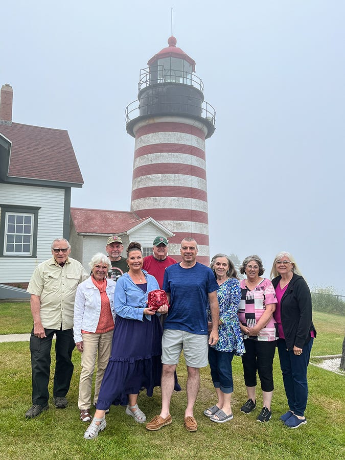 Before the start of the July 9, 2024 WQHLKA board of trustees meeting, Kimberly unveiled the gargoyle donation to the trustees and shared Michael’s Cyr’s story and kindness with the group. The trustees were thrilled to see such a wonderful addition to the WQHLKA Visitors Center and Museum. A group photo was taken in front of the lighthouse with the gargoyle – celebrating the fact that lighthouse history continues to be made at West Quoddy Head Lighthouse. Thank you, Michel Cyr!