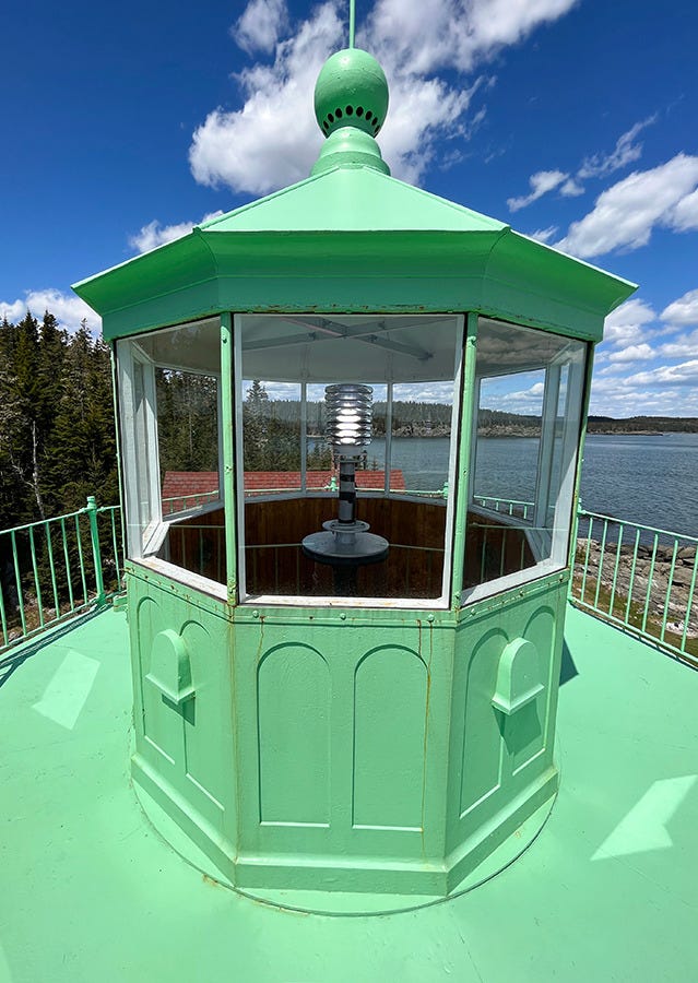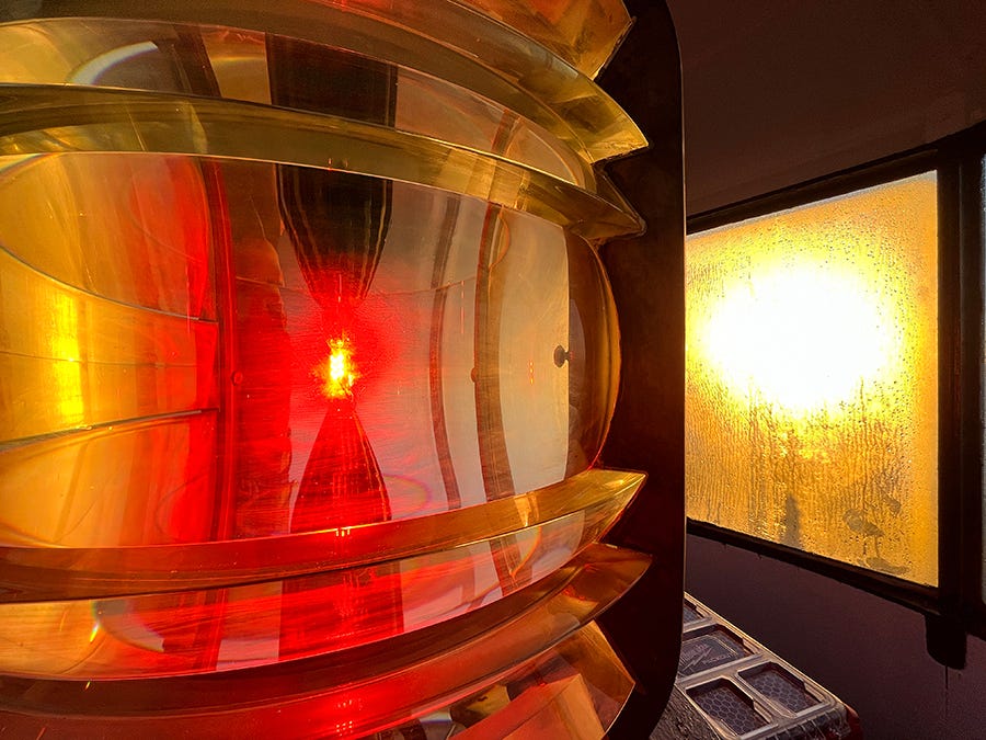 The parapet, panes and cupola comprise this multi-sided realm – bright and vented. The bygone lighthouse keepers knew such surroundings well. They spent many an hour in the lantern polishing the Fresnel lens, trimming the wicks and tidying up every surface about them.